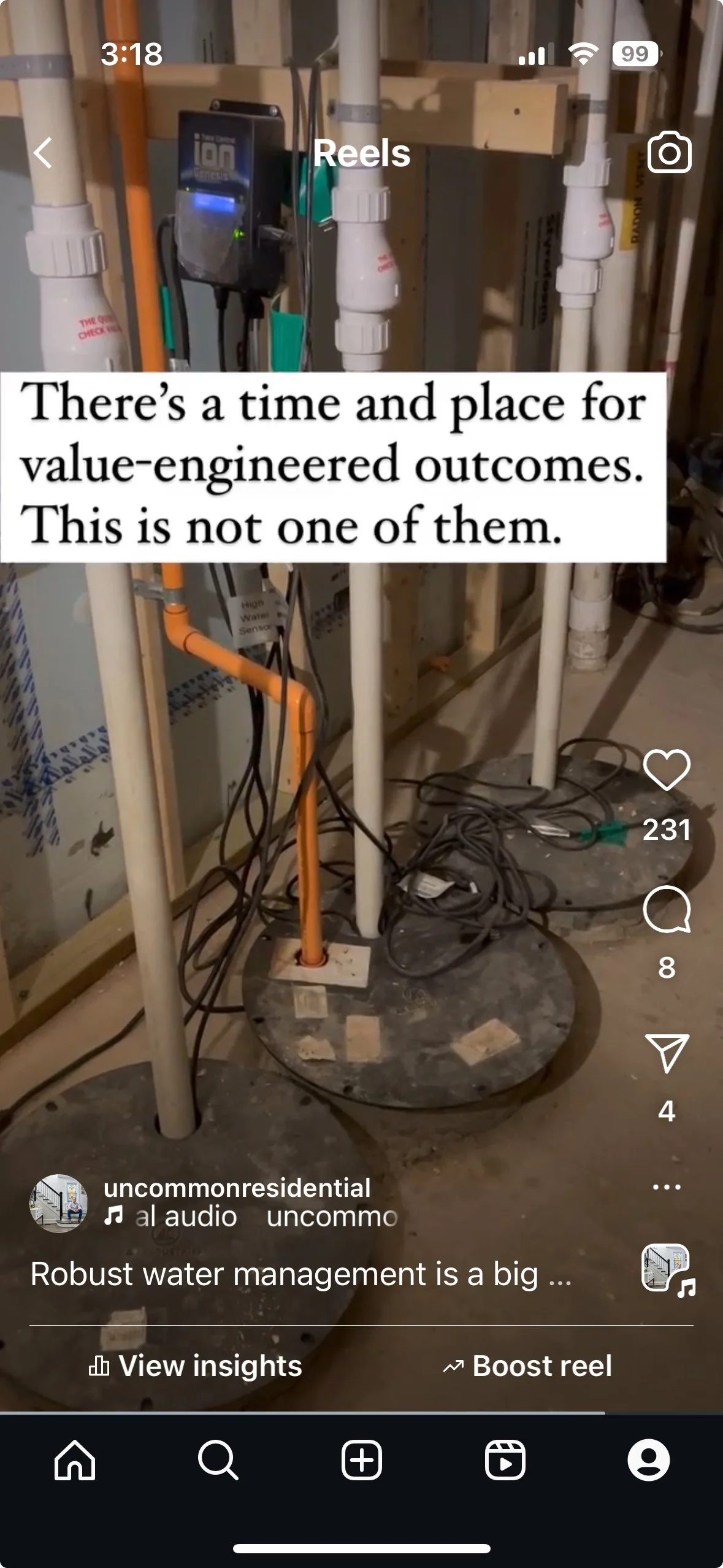 An example of a basement sump pump system we installed in a new home. Due to the size of the finished basement and environmental factors, we installed three separate sump pits with a dedicated electrical circuit for each. The center pit had a dual pump system, and both pits flanking it had an overflow backup pump that would activate in the event of a main pump failure or storm event that caused excess water buildup near the foundation. The system was connected to an automatic alarm system that would alert if a pump failed or the water level reached a certain height. The entire sump pump system was backed up by a whole home generator that would switch on automatically if the power went out. While your particular basement might not need this, it is worth considering two sump pumps and two pits with at least a battery backup for some level of redundancy that will save a basement from flooding in many common circumstances.