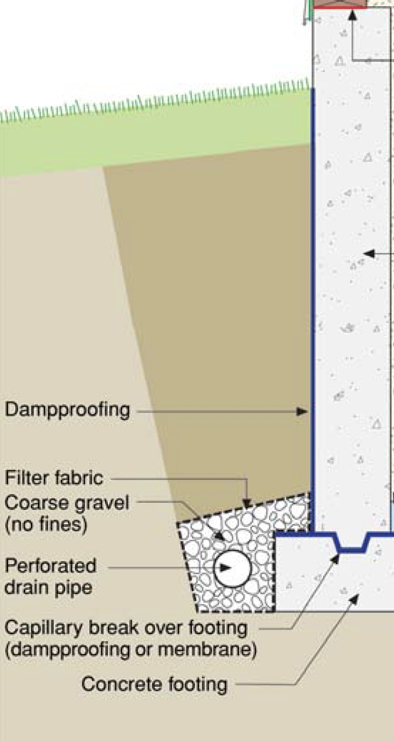 A cross-section showing a perforated drain pipe on the exterior of the foundation, installed in a bed of coarse gravel and surrounded by filter fabric. The pipe is usually 4” or 6” diameter and helps carry water away from the foundation. A similar strategy is often found under the basement slab on the interior for additional protection. Illustration credit: Understanding Basements, Joseph Lstiburek, Building Science Digest 103. (c) 2006.